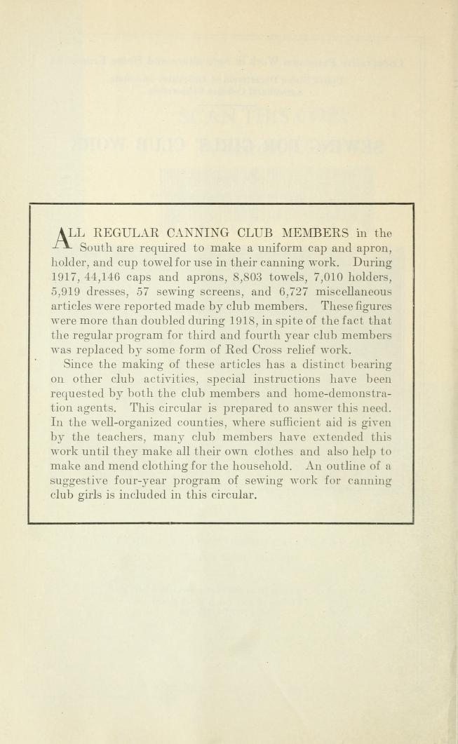 ALL REGULAR CANNING CLUB MEMBERS in the South, are required to make a uniform cap and apron, holder, and cup towel for use in their canning work. During 1917, 44,146 caps and aprons, 8,803 towels, 7,010 holders, 5,919 dresses, 57 sewing screens, and 6,727 miscellaneous articles were reported made by club members. These figures were more than doubled during 1918, in spite of the fact that the regular program for third and fourth year club members was replaced by some form of Red Cross relief work.