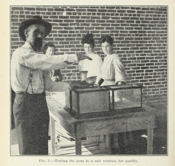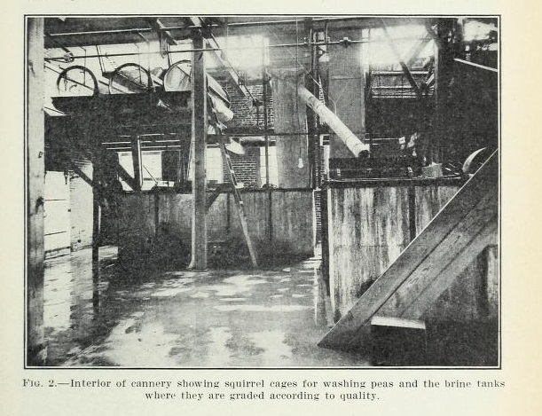 According to the early accounts of the art of canning, peas were among the first vegetables to be preserved in this manner, and later they were among the first to enter the canned-goods trade. Pea canning may be said, therefore, to be as old as the canning industry. At first the process was used only to preserve such choice fruits and vegetables as were most difficult to keep in the fresh state, as the cost of glass bottles and earthenware jars prevented their use for cheaper products. After the invention of the tin can, as the cost was lessened, peas became one of the most important articles packed. The pea-canning industry began in this country in Baltimore during the Fifties. There was an immediate demand for the product, and consequently some packing was done at nearly every factory. The peas were grown garden fashion and picked and podded by hand: but the labor required was so great that the output was small and the price high. The methods used did not differ in an} 7 essential detail from those followed in preparing fresh peas in the kitchen. The demand continued to increase, but the total output of all the early factories would not equal that of one small modern plant.