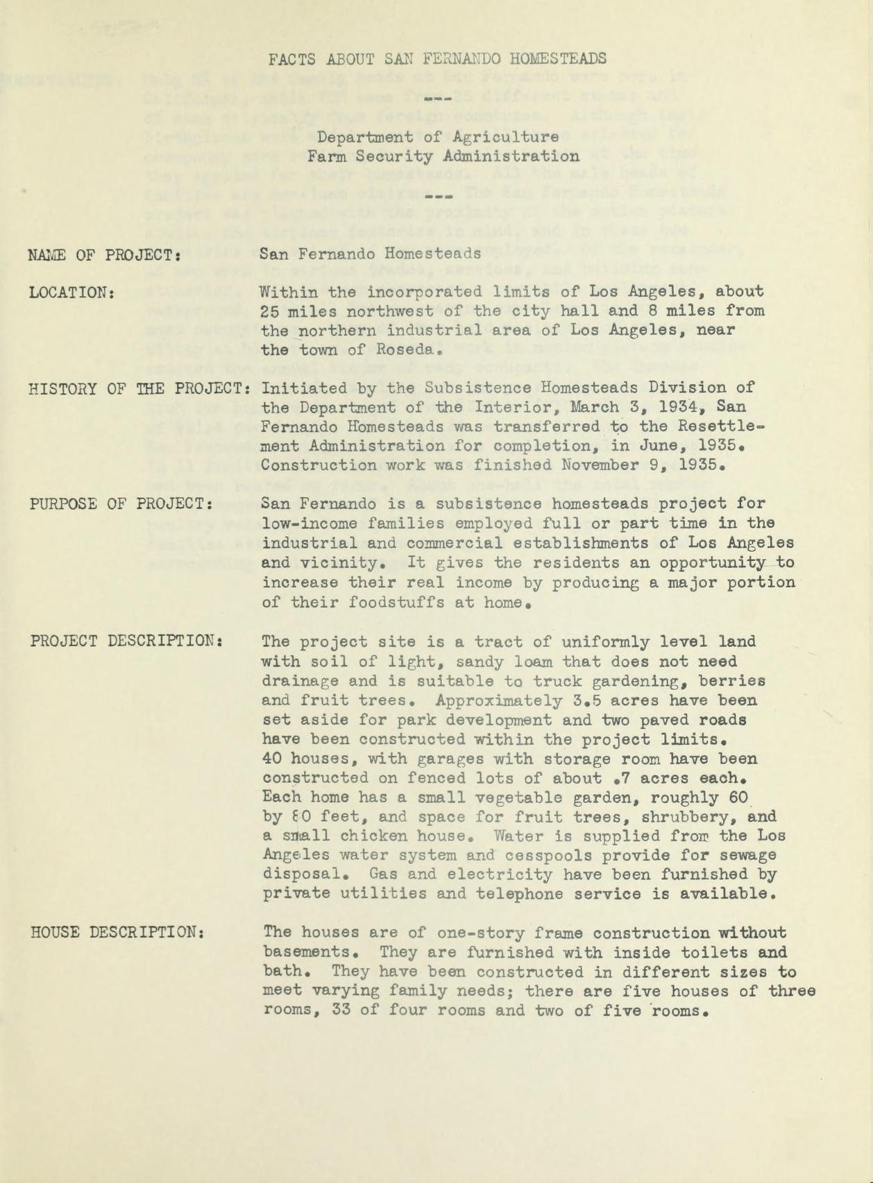 Initiated by the Subsistence Homesteads Division of the Department of the Interior, March 3, 1934, San Fernando Homesteads was transferred to the Resettlement Administration for completion, in June, 1935. Construction work was finished November 9, 1935.