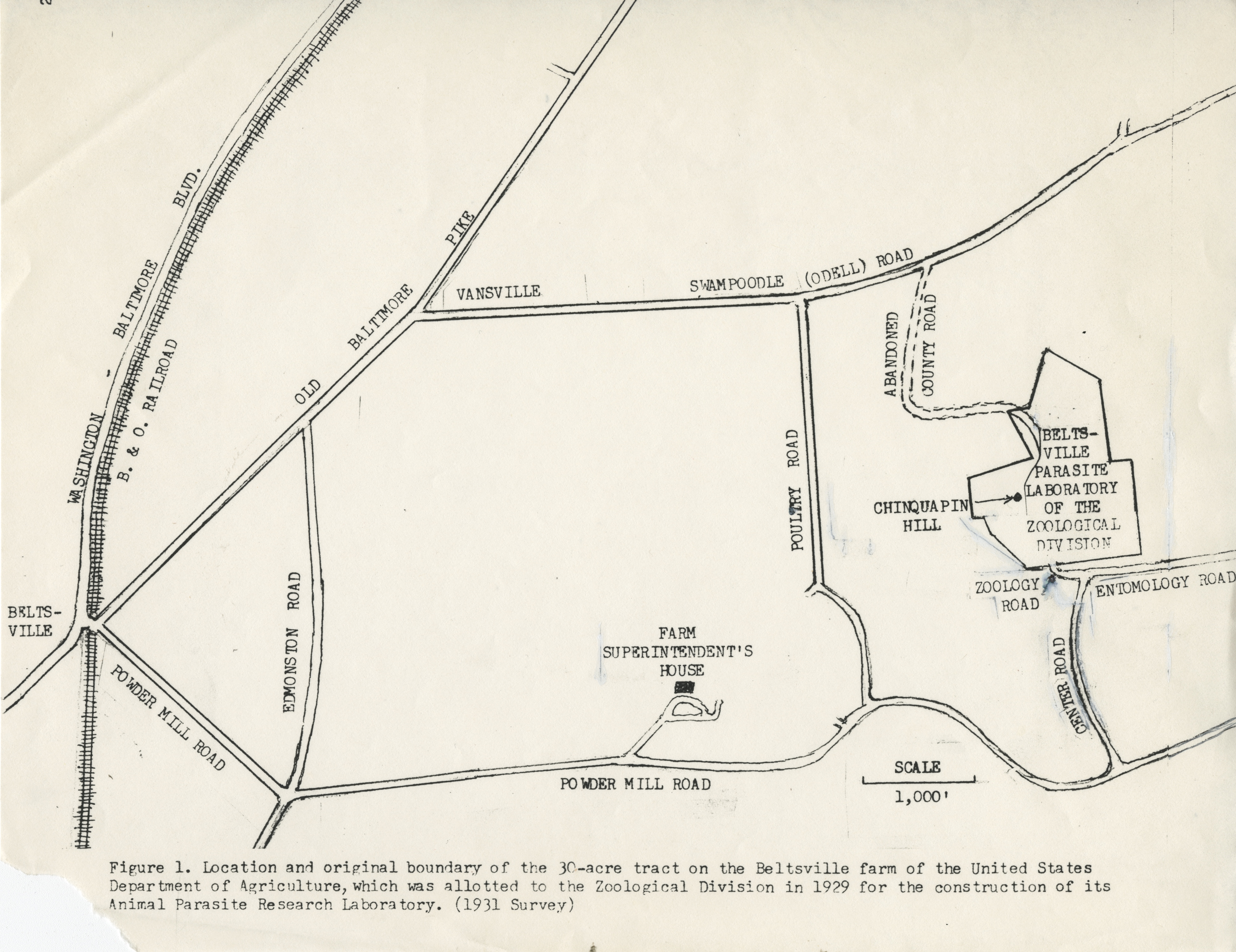 Unknown. 1931. “Location and original boundary of the 30-acre tract on the Beltsville farm of the U.S. Department of Agriculture, which was allotted to the Zoological Division in 1929 for the construction of its Animal Parasite Research Laboratory.” Special Collections, USDA National Agricultural Library. Accessed November 7, 2025, https://www.nal.usda.gov/exhibits/speccoll/items/show/8093.