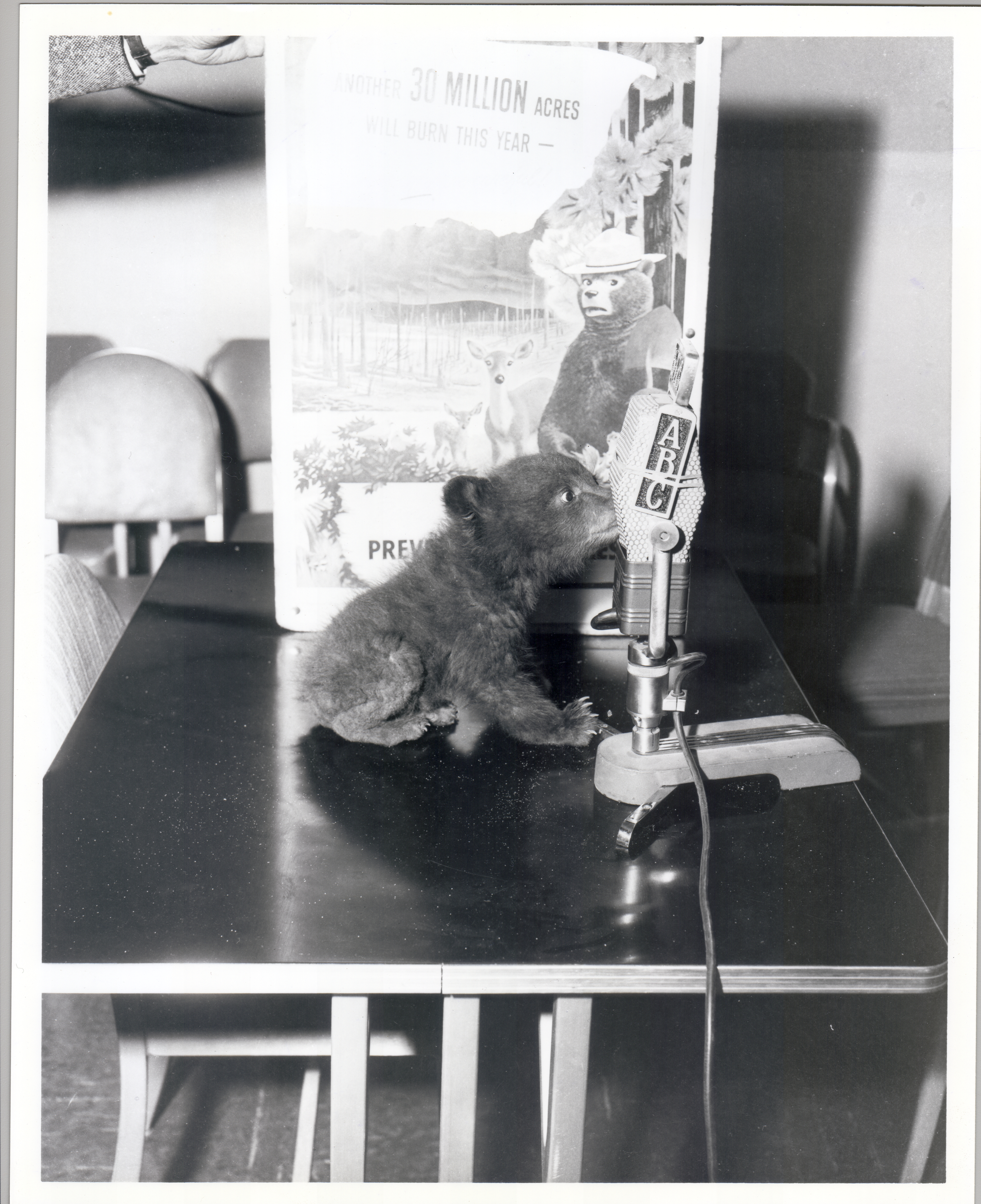 Unknown. 1950. “Young Smokey Bear on ABC radio.” Special Collections, USDA National Agricultural Library. Accessed November 7, 2025, https://www.nal.usda.gov/exhibits/speccoll/items/show/8209.